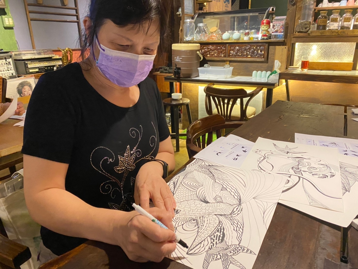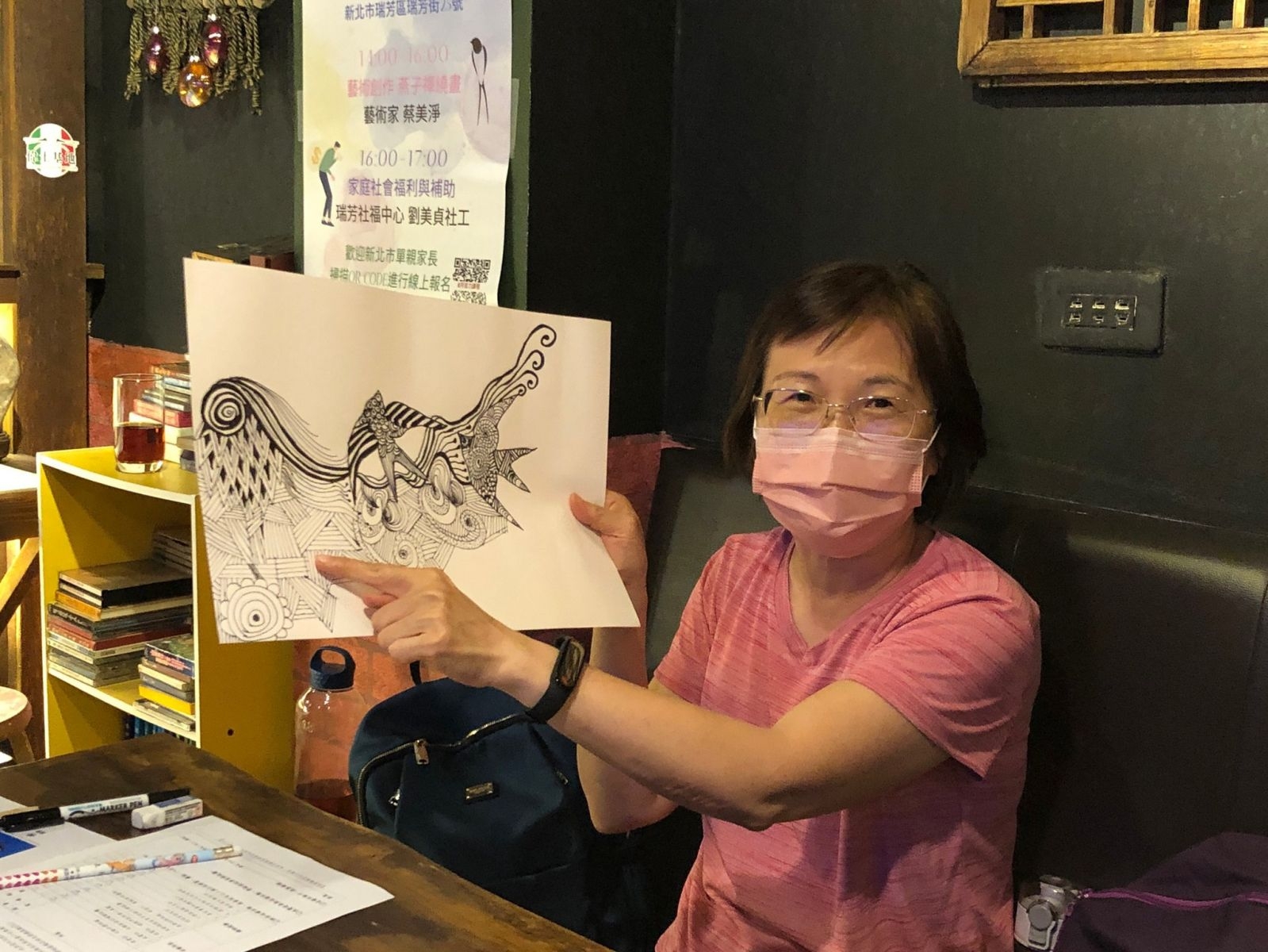 可能大家知道咖啡廳由一對夫妻經營,但你們知道長髮飄逸的老闆/闆娘蔡美淨,也是一位藝術家,擅長素描和水彩,過往也曾帶著瑞芳區的長者進行繪畫課程,所以授課對美淨來說其實不太難,但 #單親培力方案 的社工,當然要出出考題,讓新北市各區的單親家長為我們瑞芳留下印象,產生與瑞芳區域之間的連結,於是有了這次的「燕子禪繞畫」。