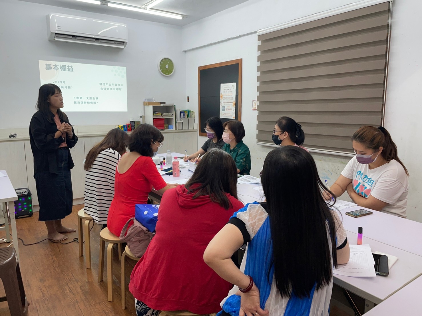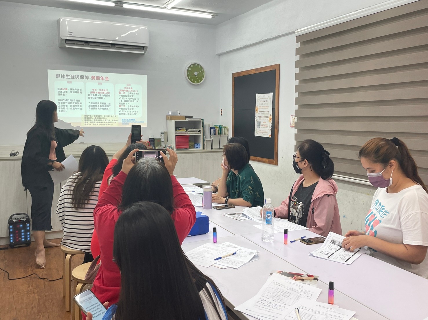 最後的時間,社工與成員分享勞工基本權益,包含最低薪資、上班第一天即可投保勞保、國民年金年資可以合併勞保年資等等,此時成員開始能彼此交流,不再以講師為主,成員此起彼落的討論聲音,現場氣氛熱絡,也能感受得到他們對中高齡就業權益的重視與好奇之處。