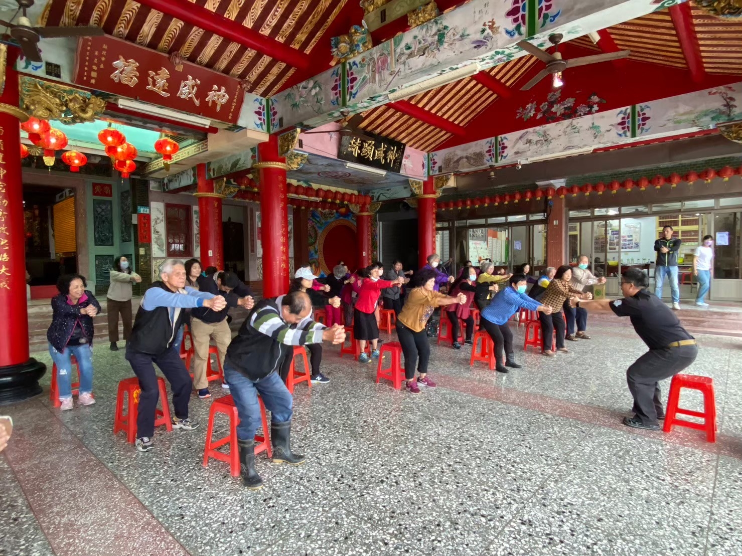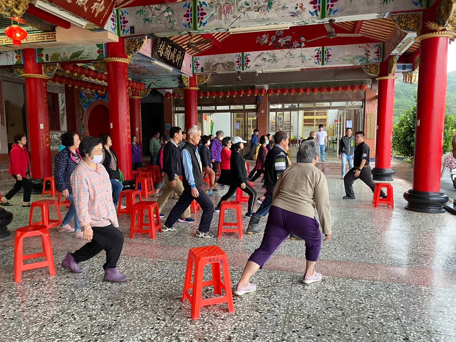講師也帶領長者於南天宮前廣場進行深蹲、抬腿、伸展等動作,透過又動又靜的課程安排,不僅幫助成員提升身體保健、運動知能,同時又有親身體驗,度過一個充實的下午時光。