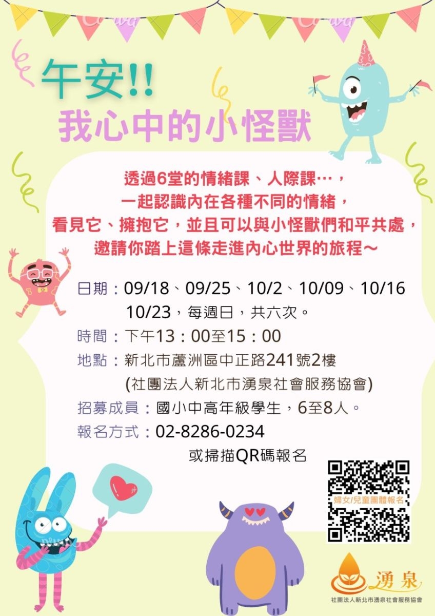 兒童團體主題:透過六堂情緒課和人際課,讓孩子認識內在各種不同的情緒,練習看見和擁抱每一種感覺,與心中的小怪獸們和平共處。