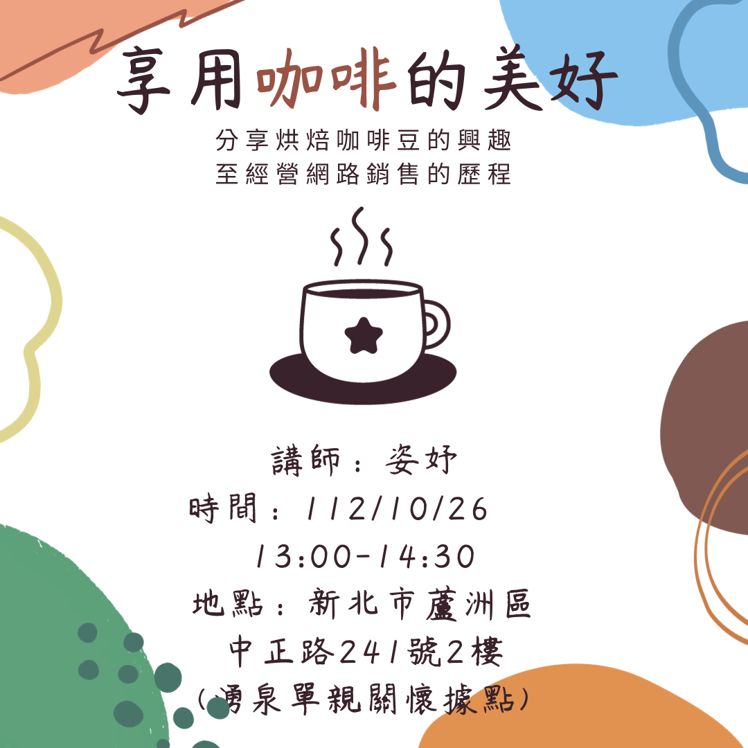 本次很開心邀請姿妤講師和大家分享如何藉由製作與烘焙咖啡的興趣,迄今能在網路販售產品的心路歷程,下午就和大家一起談心與交流,共同陪伴彼此吧!!